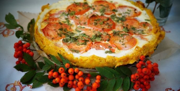 Étape 5 Battez les œufs avec du lait, ajoutez la noix de muscade, le poivre moulu et le sel. Verser le mélange dans un formulaire avec des légumes, garnir de tomates, légèrement frit des deux côtés.