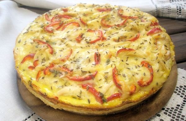 Étape 7 Verser la couche de viande avec la masse d'œufs. Saupoudrer de graines de carvi sèches et de romarin.