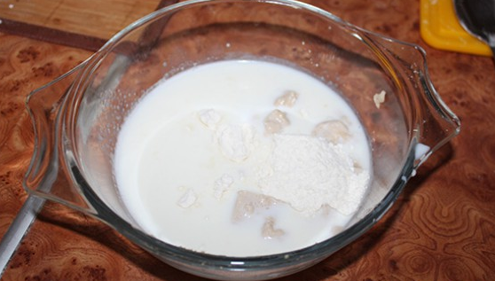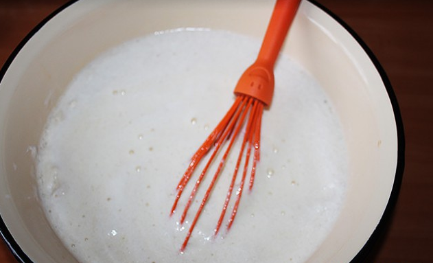Étape 1 Vous devez d'abord mettre la pâte. Diluez la levure dans du lait tiède (un demi-verre), ajoutez 1 c. une cuillerée de sucre, 2 c. cuillères à soupe de farine. Mélanger le tout jusqu'à consistance lisse et mettre dans un endroit chaud.