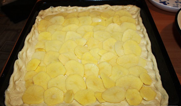 Étape 11 Lorsque la pâte lève une seconde fois, vous pouvez former un gâteau. Abaisser la pâte avec une couche et sur une plaque à pâtisserie graissée avec du beurre, pétrir la feuille entière avec les mains. Faire des pare-chocs.