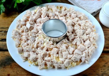 Étape 4 Ensuite, déposez la poule sur les œufs. Graisser avec de la mayonnaise.