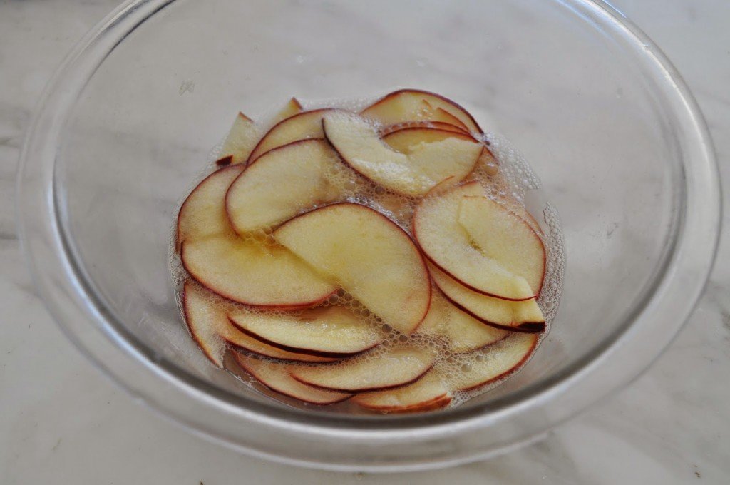 Étape 2 Transformez-les immédiatement dans un bol d'eau citronnée afin que les pommes ne s'oxydent pas et ne s'assombrissent pas. Mettez le bol de pommes au micro-ondes pendant environ 3 minutes à puissance maximale. Les tranches doivent être légèrement ramollies pour qu'il soit plus pratique de travailler avec elles, mais en même temps, ne pas se transformer en bouillie.