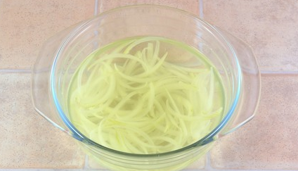 Étape 4 Pickles d'oignons hachés. Pour la marinade: prenez un demi-verre d'eau, 1 cuillère à café de sucre, 2 cuillerées à thé de vinaigre à 9% et mélangez bien jusqu'à obtenir un mélange homogène. Versez l'oignon pendant 15-20 minutes.