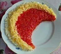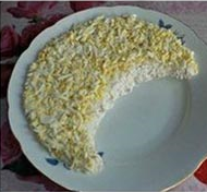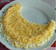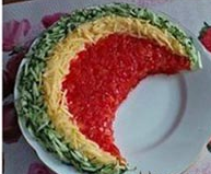 Étape 8 Mettez le fromage à pâte dure dans la couche suivante, mais du bord même, il ne doit pas être graissé avec de la mayonnaise. Il servira de pulpe sur une peau de melon d'eau.