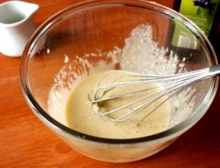 Étape 3 Vinaigrette: râpez l'ail, ajoutez les jaunes d'oeuf, la moutarde, le jus de citron, la sauce Worcester, le sel et le poivre. Bien mélanger Puis, en fouettant continuellement avec un fouet, versez un filet d'huile d'olive.