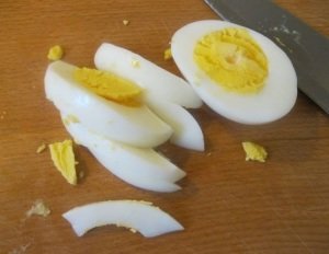 Étape 4 Faire bouillir les œufs dans un endroit frais, peler et couper en plusieurs parties dans le sens de la longueur.
