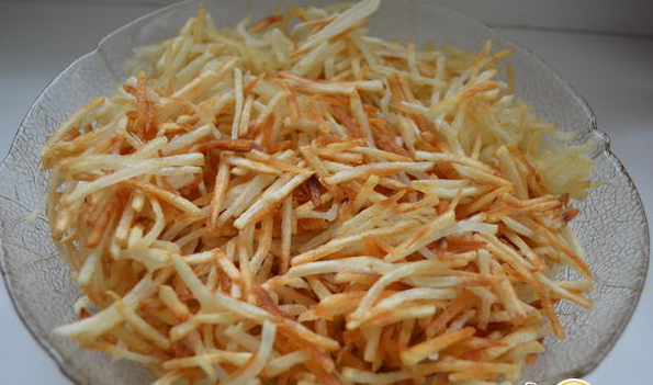 Étape 3 Pelez les pommes de terre, coupez-les en lanières. Puis frire dans l'huile en petites portions. Mettez une partie des pommes de terre dans la salade et laissez l'autre partie décorer la salade.