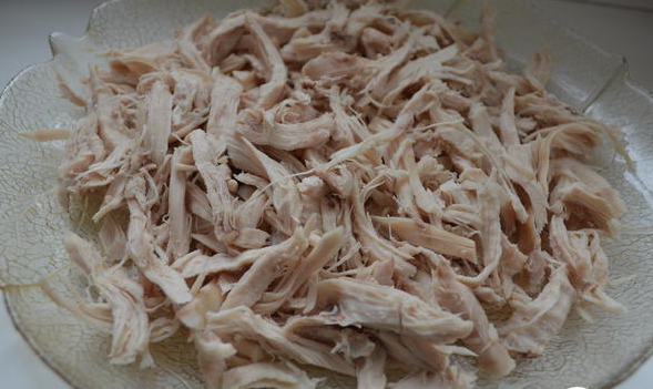Étape 1 Faire bouillir la poitrine de poulet dans de l'eau salée jusqu'à tendreté. Refroidissez et démontez en fibres.