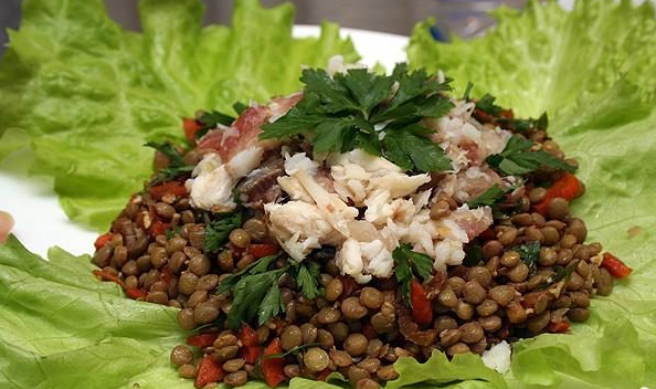 Étape 9 Mettez les lentilles avec les légumes sur les feuilles de laitue, sur les morceaux de poisson.