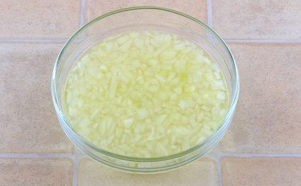 Étape 2 Hacher finement l'oignon, verser de l'eau bouillante pendant 5 minutes (ceci afin que l'oignon devienne moins tranchant).