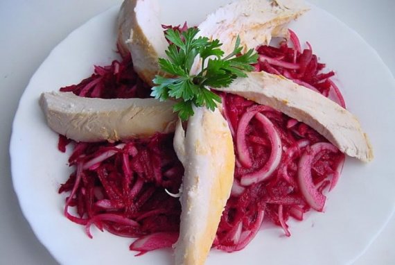 Étape 2 Mélanger les oignons avec les betteraves, le sel, le poivre, verser le jus de citron et l'huile d'olive. Bien mélanger Mettez le mélange de betteraves et d'oignons dans une assiette. Les poitrines de poulet hachées grossièrement sont joliment réparties sur le dessus. Décorer avec un brin de persil.