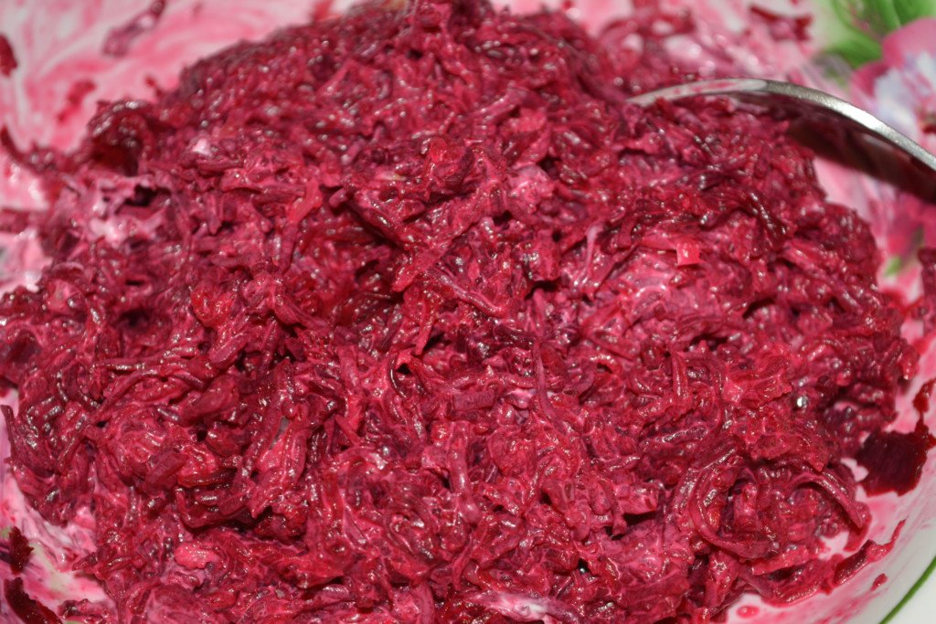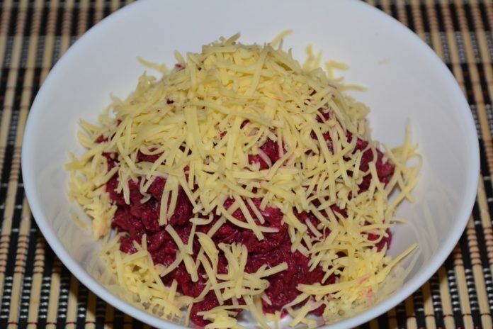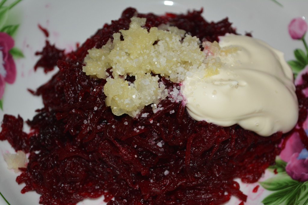 Étape 2 Aux betteraves râpées ajoutez 2 gousses d'ail, passées dans un pressoir, 1,5 à 2 cuillères à soupe de mayonnaise et de sel marin. Le sel peut être utilisé et table ordinaire.