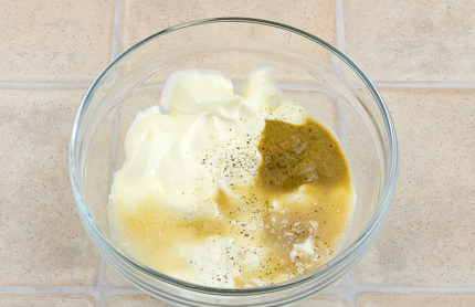 Étape 4 Préparer la vinaigrette: mélanger la mayonnaise, la crème sure, la moutarde, le vinaigre, le sucre, le sel et le poivre noir. Remuez bien.