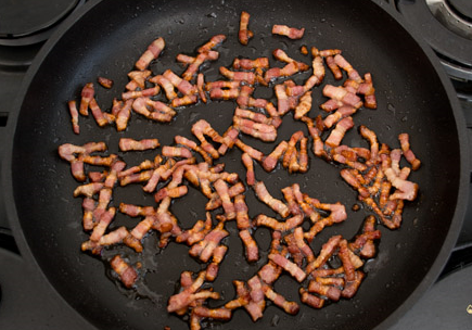 Étape 1 Coupez le lard en petits morceaux et faites-le frire dans une poêle jusqu'à ce qu'il soit croustillant (ne versez pas d'huile). Retirer le bacon, mettre sur une assiette recouverte d'une serviette en papier pour enlever l'excès de graisse.