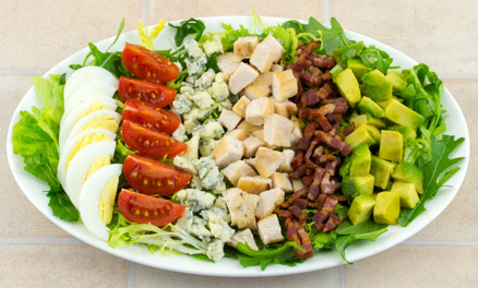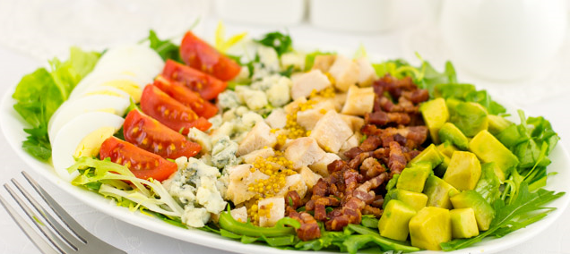 Étape 8 Mettez les feuilles de laitue sur une assiette. Pondre les œufs, les tomates, le fromage, le poulet, le bacon et l’avocat en rangs bien rangés.