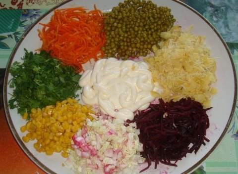 Étape 6 Maintenant, mettez les légumes sur le plat dans des lames séparées: poulet, betteraves, carottes, concombres, pois verts, chou de Chine haché, maïs, frites. Marquez les bordures avec de la mayonnaise sur le dessus ou disposez quelques cuillères à soupe de mayonnaise au milieu (facultatif).