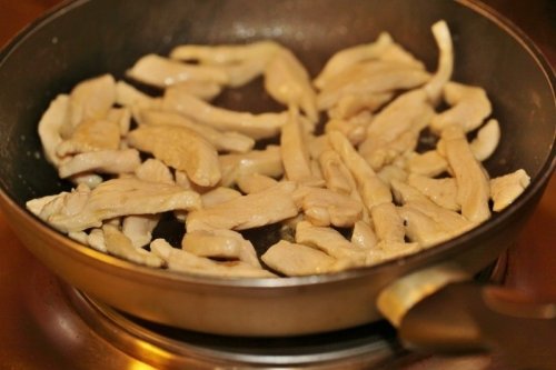 Étape 1 Rincer la poitrine de poulet et couper en fines lanières. Ensuite, faites les frire jusqu'à ce qu'ils soient dorés.