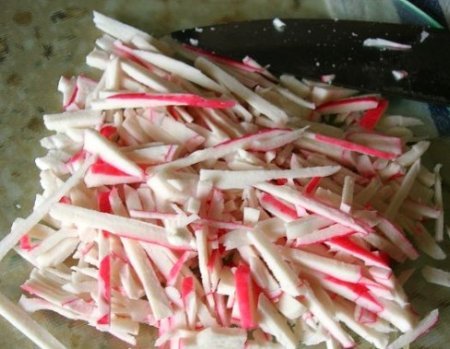 Étape 2 Couper les bâtonnets de crabe en fines lanières.