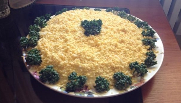 Étape 9 La dernière couche est une décoration de salade avec des jaunes et des verts râpés. Avant de servir, laissez la salade infuser et laissez tremper dans un endroit froid pendant 2 heures.
