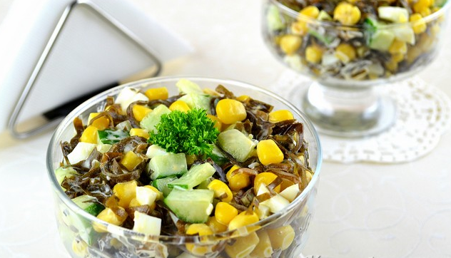 Étape 3 Mettez les algues, les concombres, les œufs et le maïs dans un saladier. Ajouter la mayonnaise, saler et bien mélanger.