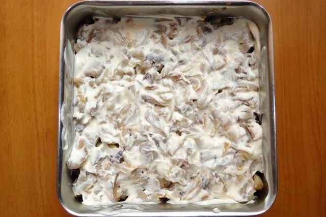 Étape 3 Épluchez, hachez, ajoutez les champignons à l'oignon et faites-les frire dans une petite quantité d'huile végétale jusqu'à tendreté. Saler. Mettez une couche sur les biscuits.