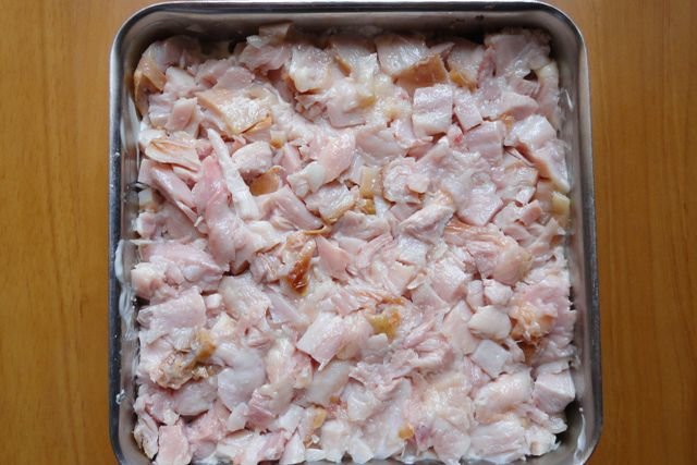Étape 5 Pelez le poulet fumé, coupez la viande des os et coupez-le en petits cubes. Disposez la couche suivante.