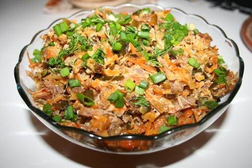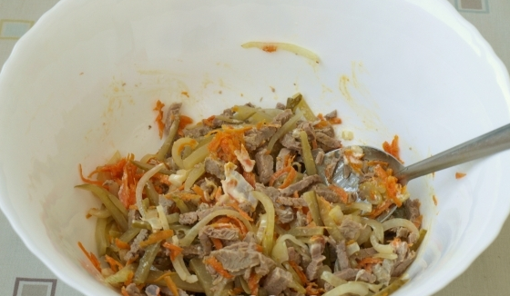 Étape 6 Ensuite, mettez la viande, les concombres, les oignons et les carottes dans un saladier. Pressez l'ail dans le presse-ail.