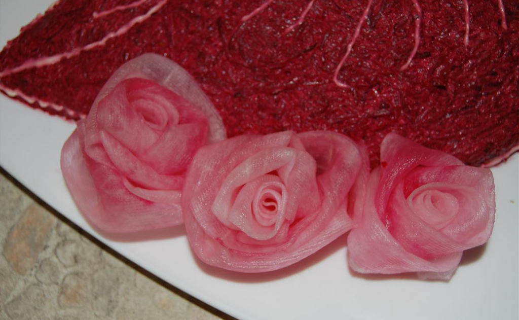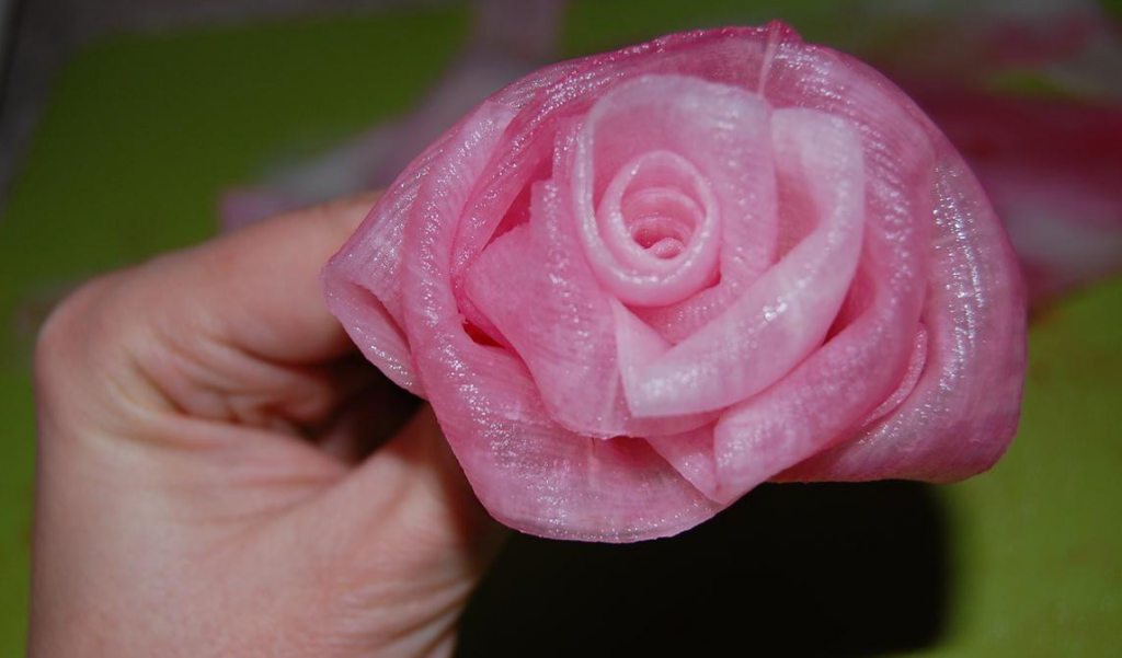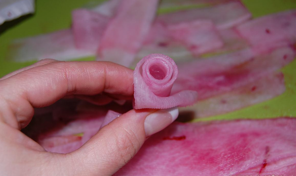 Étape 15 Maintenant, tordez les roses de daikon en formant des pétales. Fixez la rose finie avec un cure-dent.