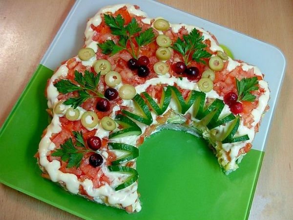 Étape 11 Sur le contour de la salade, faire un trait de mayonnaise, garnir d'olives, de maïs, de graines de grenade et de feuilles de persil. Vous pouvez également utiliser des baies, des canneberges ou du viorne pour la décoration.