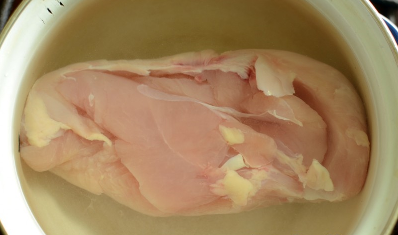Étape 1 Cuire la poitrine de poulet dans de l'eau salée pendant environ 30 minutes. Il est préférable de mettre la viande dans de l'eau bouillante pour qu'elle perde moins de jus pendant la cuisson.
