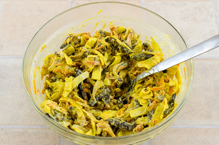 Étape 12 Ajouter un peu de mayonnaise, vinaigre, ail pressé, presser, mélanger, saler si nécessaire.