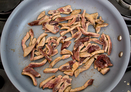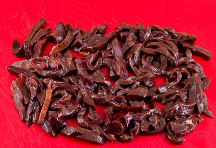Étape 9 Lavez le foie et retirez le film. Couper en fines lanières afin que le foie soit bien coupé, il est conseillé de le «congeler» un peu à l’avance (mettre au congélateur pendant une demi-heure ou une heure).