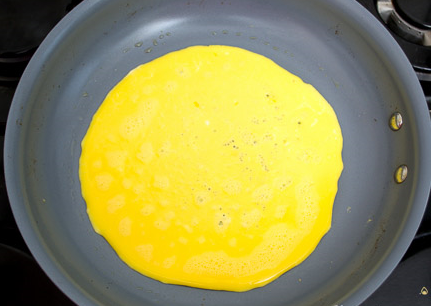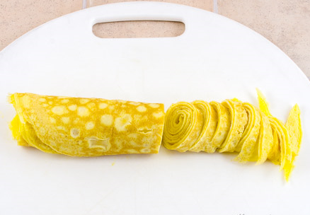 Étape 7 Faites cuire le reste des œufs de la même manière. Plier les crêpes en une pile, les rouler en un rouleau et les couper en lanières de quelques centimètres.