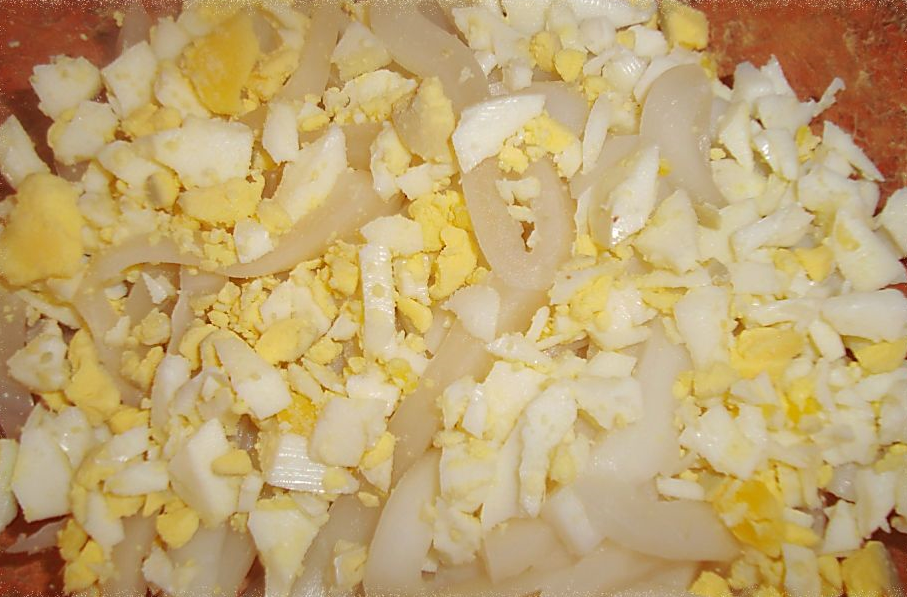 Étape 3 Coupez les œufs en petits cubes et ajoutez-les au calmar.