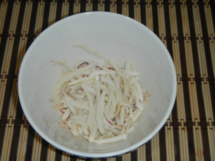 Étape 1 Cuire les carcasses de calmar. Trempez les calmars pelés dans de l'eau bouillante et laissez cuire pendant 2-3 minutes. Puis sortez de l'eau, refroidissez sous l'eau courante. Couper en fines lanières.