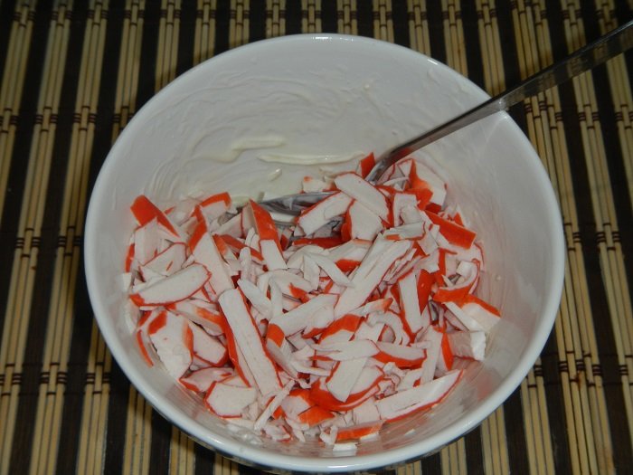 Étape 3 Couper les bâtonnets de crabe en petites lanières.