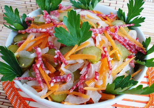 Étape 5 Mélanger tous les ingrédients dans un saladier. Sel au goût, mais l'apéritif est déjà assez salé, il est donc possible que le sel n'est pas nécessaire. Laisser reposer au réfrigérateur pendant une demi-heure et décorer avec des feuilles de persil. Vous pouvez servir une salade.