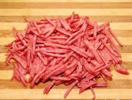 Étape 3 Couper la saucisse en lanières.