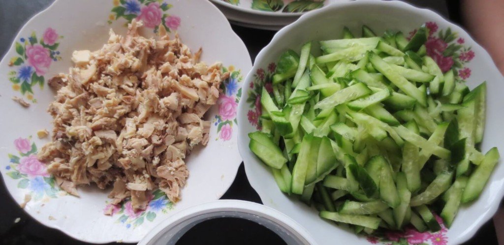 Étape 1 Faire bouillir la viande dans de l'eau salée. Laisser refroidir et couper en petits morceaux. Couper les concombres en fines lanières.