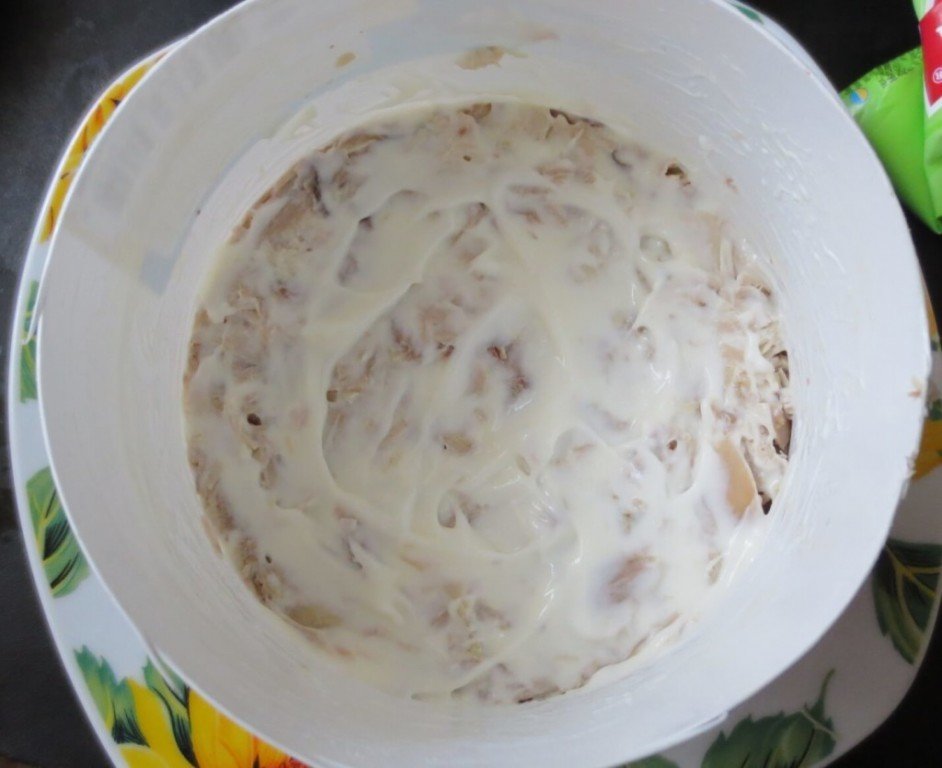 Étape 3 Lay la salade en couches: la première couche est la viande bouillie, graissée avec de la mayonnaise sur le dessus.