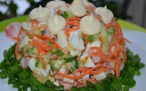 Étape 5 Mélanger tous les ingrédients préparés et ajouter les carottes coréennes. Salade, poivre, assaisonner avec de la mayonnaise. Mettez la salade dans un plat, garnissez d'oignons verts hachés.