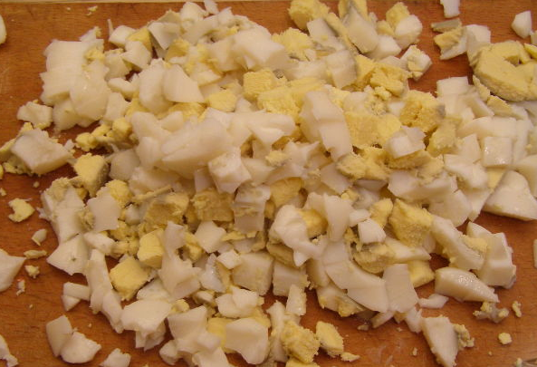 Étape 3 Couper le poulet en petits morceaux (si désiré, râper les œufs sur une râpe grossière).