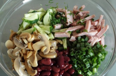 Étape 3 Champignons coupés en petits morceaux ou en assiettes, ajouter les haricots et les légumes verts hachés finement
