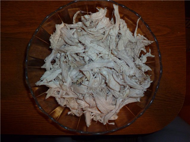 Étape 2 Faire bouillir la poitrine de poulet dans de l'eau salée jusqu'à tendreté. Refroidissez et démontez en fibres.