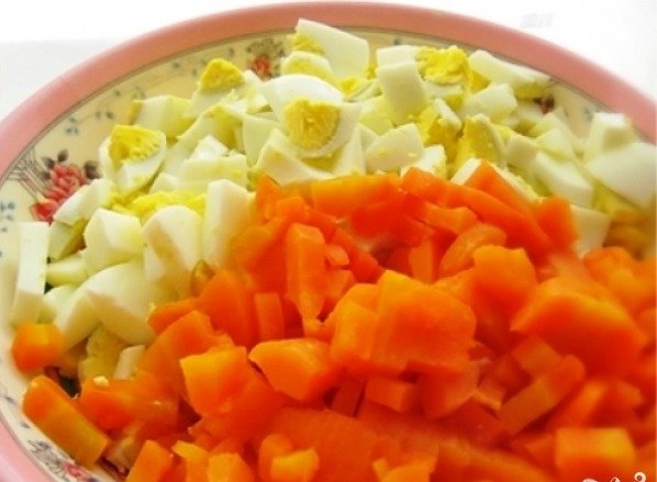 Étape 3 Faire bouillir les œufs dans un endroit frais, peler et couper en petits morceaux. Faire bouillir les carottes jusqu'à ce qu'elles soient tendres et les couper en petits cubes.