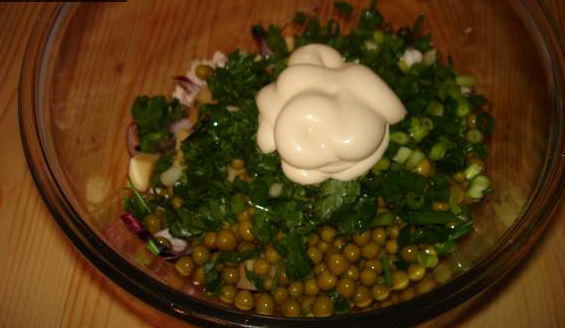 Étape 5 Mélanger tous les ingrédients préparés. Ajouter les verts hachés. Assaisonner la salade avec de la mayonnaise.