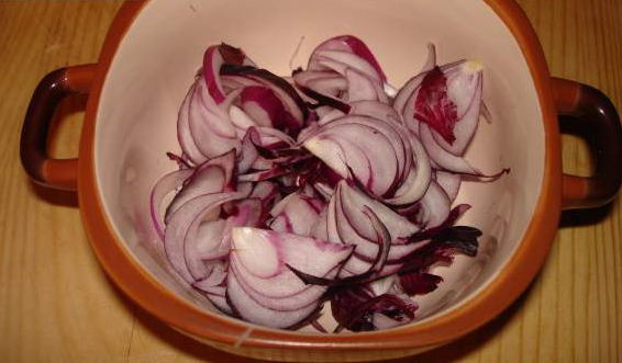 Étape 3 Oignon coupé en demi-rondelles. Échaudez l'oignon avec de l'eau bouillante et arrosez-le de jus de citron.