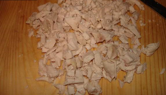 Étape 2 Faire bouillir le filet de poulet dans de l'eau salée jusqu'à tendreté, laisser refroidir. Ensuite, coupez la viande en petits cubes.