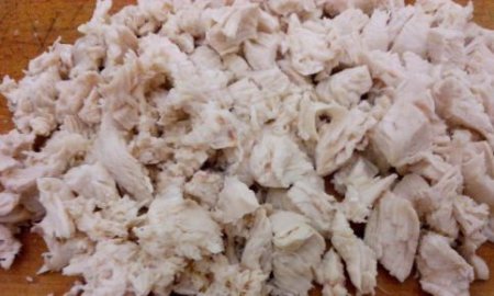 Étape 1 Faire bouillir le poulet dans de l'eau salée jusqu'à tendreté, laisser refroidir. Ensuite, coupez la viande en petits morceaux.