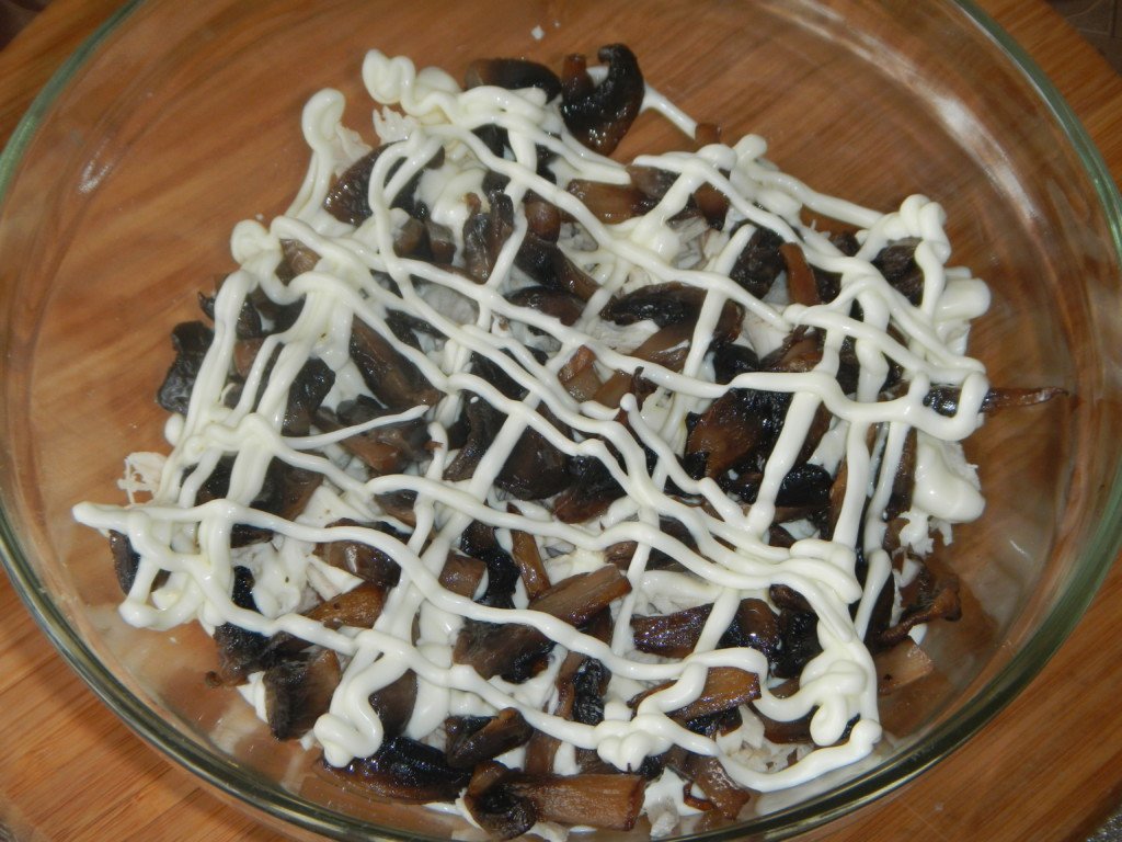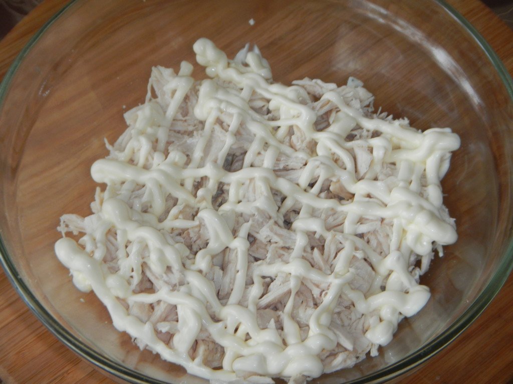 Étape 5 Ensuite, posez le poulet, graissez avec de la mayonnaise.